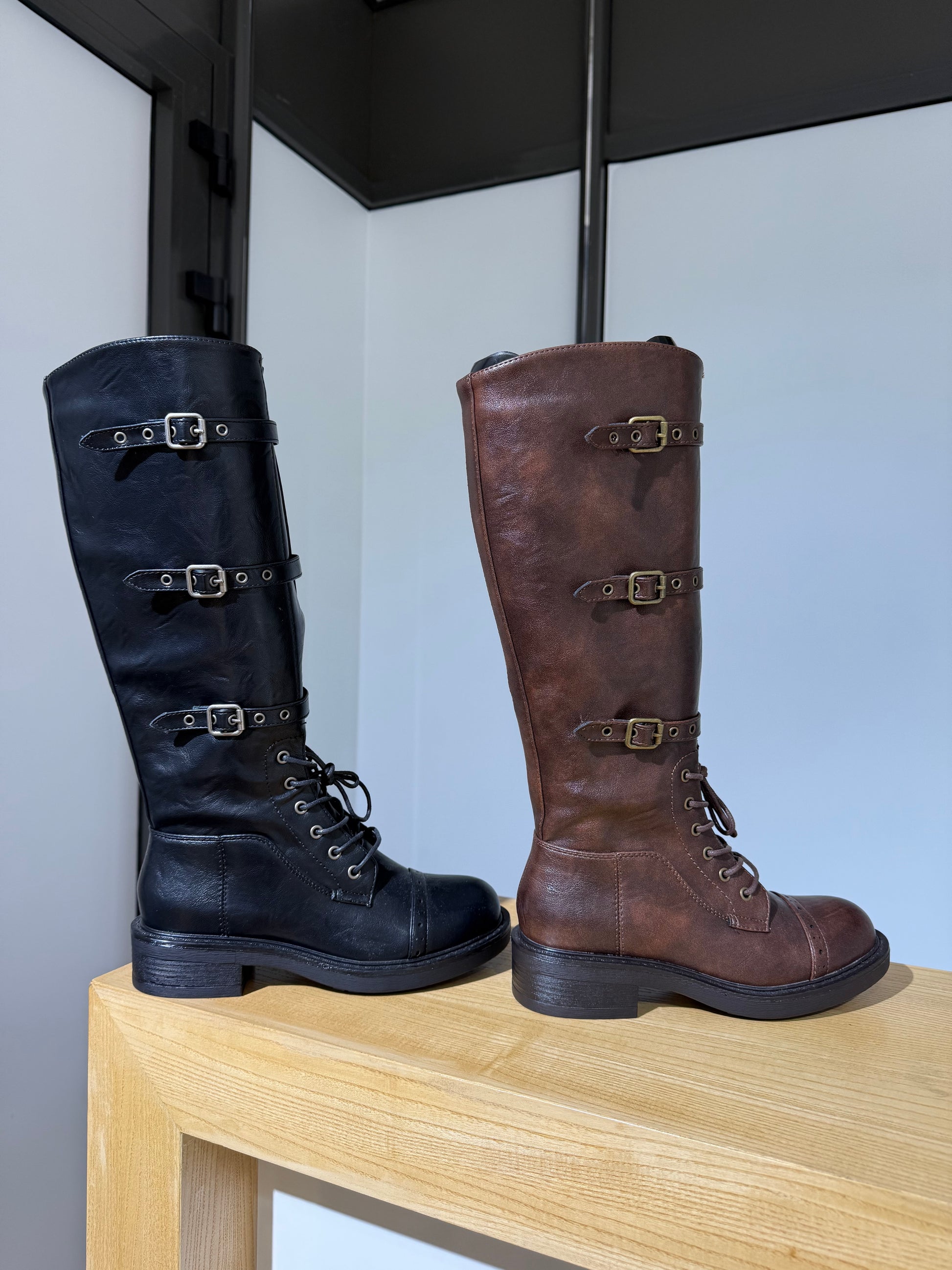 Dit zijn zwarte kniehoge laarzen in de stijl van combat- of motorlaarzen, met opvallende gespdetails en veters. Ze hebben een gestructureerde afwerking en een dikke, zwarte zool.